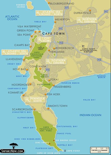 Kaapstad is ingeklemd tussen de Atlantische oceaan aan de westzijde en de bekende Tafelberg (1050 meter hoog), Devil's Peak er naast, aan de zuidkant en Lion's Head aan de zw zijde. Hier ligt het kleine centrum van Kaapstad tussen geklemd. Achter Lion's Head liggen de prachtige luxe wijken/ stranden zoals Clifton en Camps Bay. Kaapstad zelf is een erg moderne hipe stad, maar buiten het centrum liggen ook de trieste slopenwijken.